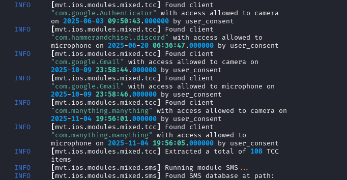 # Scan only specific components mvt-ios check-backup /backup/path/ --modules Contacts,SMS,Applications
