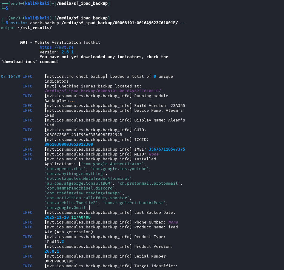 mvt-ios check-backup ./ipad_backup/ --output ./my_scan/ --iocs ./iocs/